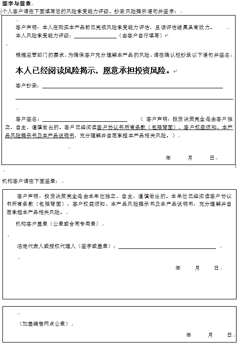 您签署本风险揭示书、客户协议书,并将资金委托给中国建设银行重庆市分行运作是您真实的意思表示。本风险揭示书及相应的客户协议书、产品说明书、客户权益须知将共同构成贵我双方理财合同的有效组成部分。