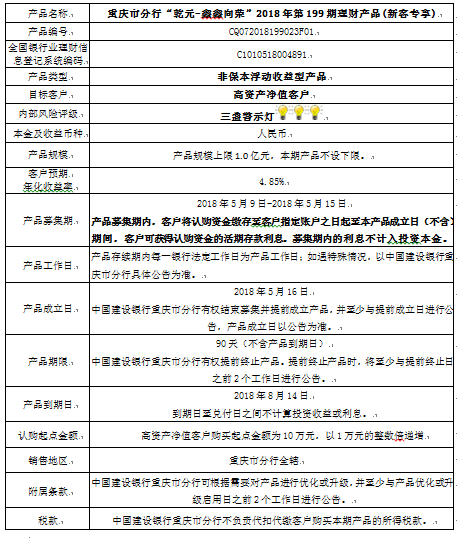 3.中国建设银行重庆市分行可根据市场情况等调整产品规模上、下限,并最迟于调整规模上下限当日进行公告。