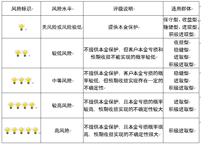 本产品为非保本浮动收益型理财产品,不保证本金和收益,请您充分认识投资风险,谨慎投资。本期产品期限为153天(中国建设银行有权对产品进行展期或提前终止),存续期内,产品不接受申购或赎回申请。本期产品内部风险评级级别为盏警示灯 ,风险水平属于较低风险。最不利情况下,您将损失全部收益甚至包括全部本金。本理财产品适用于收益型、稳健型、进取型 积极进取型客户。