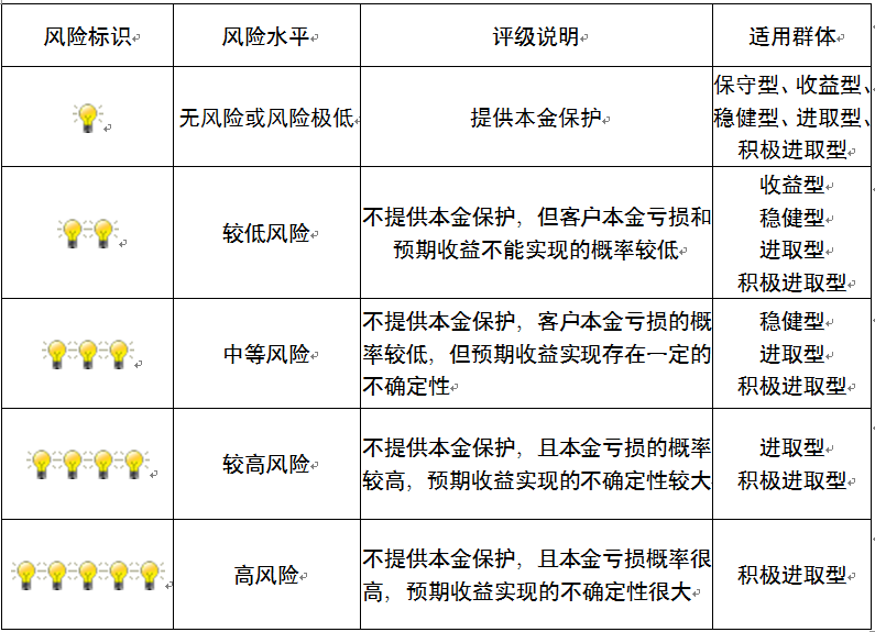 本产品为非保本浮动收益型理财产品,不保证本金和收益,请您充分认识投资风险,谨慎投资。本期产品期限为189天(中国建设银行有权对产品进行展期或提前终止),存续期内,产品不接受申购或赎回申请。本期产品内部风险评级级别为二盏警示灯,风险水平属于较低风险。最不利情况下,您将损失全部收益甚至包括全部本金。本理财产品适用于收益型、稳健型、进取型 、积极进取型客户。