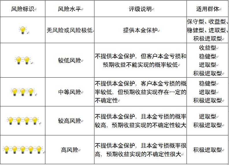 本产品为非保本浮动收益型理财产品,不保证本金和收益,请您充分认识投资风险,谨慎投资。本期产品期限为120天(中国建设银行有权对产品进行展期或提前终止),存续期内,产品不接受申购或赎回申请。本期产品内部风险评级级别为盏警示灯,风险水平属于较低风险。最不利情况下,您将损失全部收益甚至包括全部本金。本理财产品适用于收益型、稳健型、进取型 积极进取型客户。