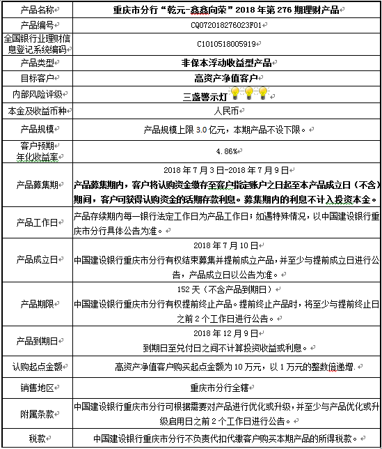 中国建设银行重庆市分行“乾元-鑫鑫向荣” 2018年第276期理财产品风险揭示书和产品说明书