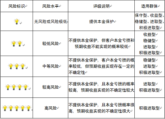 本产品为非保本浮动收益型理财产品,不保证本金和收益,请您充分认识投资风险,谨慎投资。本期产品期限为122天(中国建设银行有权对产品进行展期或提前终止),存续期内,产品不接受申购或赎回申请。本期产品内部风险评级级别为二盏警示灯,风险水平属于较低风险。最不利情况下,您将损失全部收益甚至包括全部本金。本理财产品适用于收益型、稳健型、进取型 、积极进取型客户。