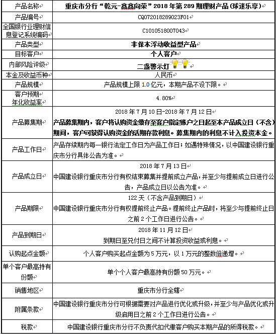 1.本期产品规模上限:1.0亿元。在本期产品募集期内,对本期产品的认购金额达到本期理财产品规模上限,则中国建设银行重庆市分行有权利但无义务停止本期产品的认购,已经认购成功的客户投资权益不受影响。