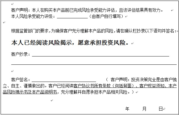 个人客户请在下面填写您的风险承受能力评级、抄录风险揭示语句并签字:、