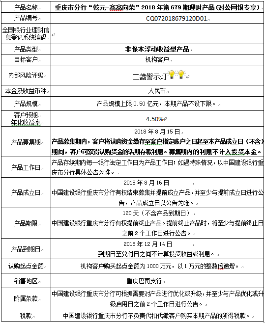 中国建设银行重庆市分行“乾元-鑫鑫向荣” 2018年第679期理财产品风险揭示书和产品说明书