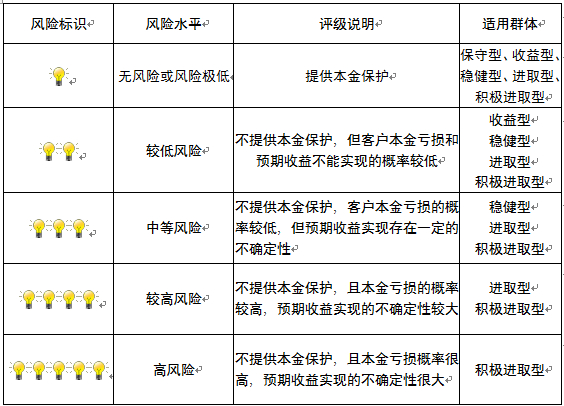 本产品为非保本浮动收益型理财产品,不保证本金和收益,请您充分认识投资风险,谨慎投资。本期产品期限为90天(中国建设银行有权对产品进行展期或提前终止),存续期内,产品不接受申购或赎回申请。本期产品内部风险评级级别为盏警示灯 ,风险水平属于较低风险。最不利情况下,您将损失全部收益甚至包括全部本金。本理财产品适用于收益型、稳健型、进取型 积极进取型客户。