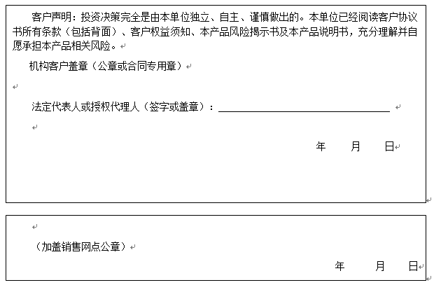 客户签名:                                    客户声明:投资决策完全是由客户独立、自主、谨慎做出的。客户已经阅读客户协议书所有条款(包括背面)、客户权益须知、本产品风险揭示书及本产品说明书,充分理解并自愿承担本产品相关风险。)