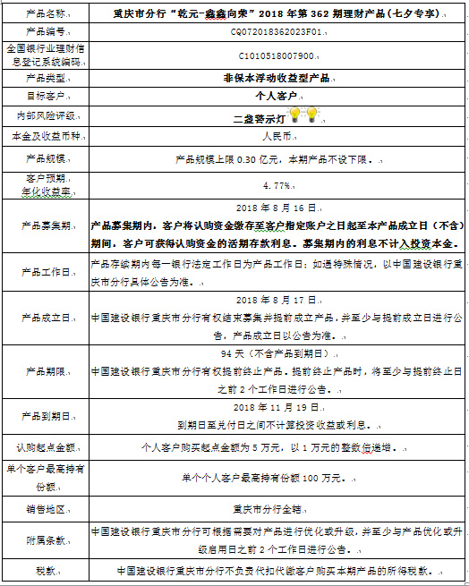 中国建设银行重庆市分行“乾元-鑫鑫向荣” 2018年第362期理财产品风险揭示书和产品说明书
