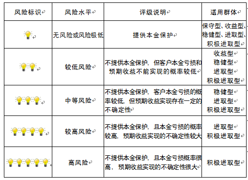 本产品为非保本浮动收益型理财产品,不保证本金和收益,请您充分认识投资风险,谨慎投资。本期产品期限为184天(中国建设银行有权对产品进行展期或提前终止),存续期内,产品不接受申购或赎回申请。本期产品内部风险评级级别为二盏警示灯 ,风险水平属于较低风险。最不利情况下,您将损失全部收益甚至包括全部本金。本理财产品适用于收益型、稳健型、进取型 、积极进取型客户。