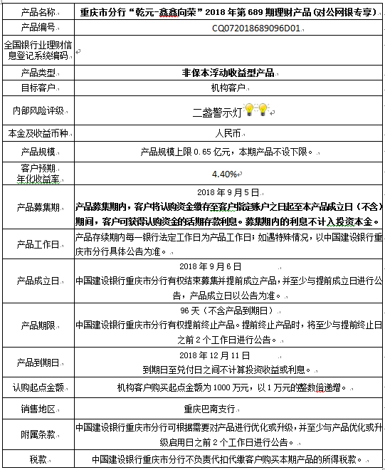 本产品为非保本浮动收益型理财产品,不保证本金和收益,请您充分认识投资风险,谨慎投资。本期产品期限为96天(中国建设银行有权对产品进行展期或提前终止),存续期内,产品不接受申购或赎回申请。本期产品内部风险评级级别为二盏警示灯,风险水平属于较低风险。最不利情况下,您将损失全部收益甚至包括全部本金。本理财产品适用于收益型、稳健型、进取型 、积极进取型客户。