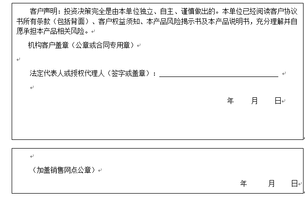 客户签名:                                    客户声明:投资决策完全是由客户独立、自主、谨慎做出的。客户已经阅读客户协议书所有条款(包括背面)、客户权益须知、本产品风险揭示书及本产品说明书,充分理解并自愿承担本产品相关风险。)