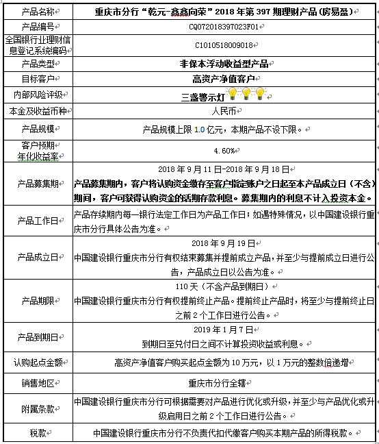 中国建设银行重庆市分行“乾元-鑫鑫向荣” 2018年第397期理财产品风险揭示书和产品说明书