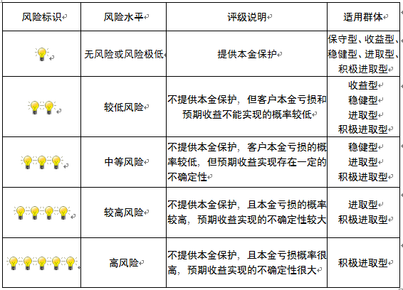 本产品为非保本浮动收益型理财产品,不保证本金和收益,请您充分认识投资风险,谨慎投资。本期产品期限为166天(中国建设银行有权对产品进行展期或提前终止),存续期内,产品不接受申购或赎回申请。本期产品内部风险评级级别为盏警示灯 ,风险水平属于较低风险。最不利情况下,您将损失全部收益甚至包括全部本金。本理财产品适用于收益型、稳健型、进取型 积极进取型客户。