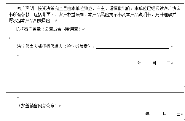 客户签名:                                    客户声明:投资决策完全是由客户独立、自主、谨慎做出的。客户已经阅读客户协议书所有条款(包括背面)、客户权益须知、本产品风险揭示书及本产品说明书,充分理解并自愿承担本产品相关风险。)