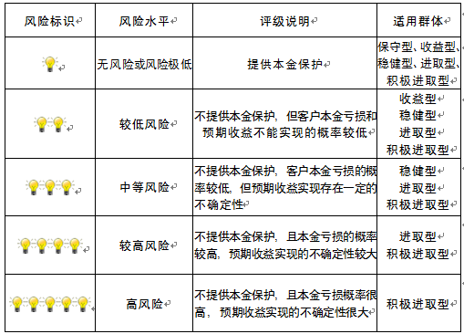 本产品为非保本浮动收益型理财产品,不保证本金和收益,请您充分认识投资风险,谨慎投资。本期产品期限为153天(中国建设银行有权对产品进行展期或提前终止),存续期内,产品不接受申购或赎回申请。本期产品内部风险评级级别为盏警示灯 ,风险水平属于较低风险。最不利情况下,您将损失全部收益甚至包括全部本金。本理财产品适用于收益型、稳健型、进取型 积极进取型客户。