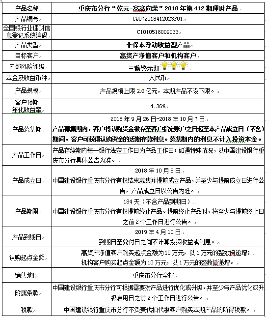 中国建设银行重庆市分行“乾元-鑫鑫向荣” 2018年第412期理财产品风险揭示书和产品说明书