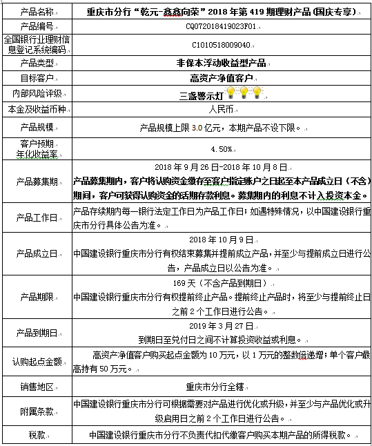 中国建设银行重庆市分行“乾元-鑫鑫向荣” 2018年第419期理财产品风险揭示书和产品说明书