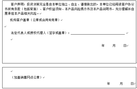 客户签名: ( 客户声明:投资决策完全是由客户独立、自主、谨慎做出的。客户已经阅读客户协议书所有条款(包括背面)、客户权益须知、本产品风险揭示书及本产品说明书,充分理解并自愿承担本产品相关风险。)