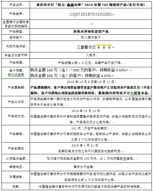 3.中国建设银行重庆市分行可根据市场情况等调整产品规模上、下限,并最迟于调整规模上下限当日进行公告。