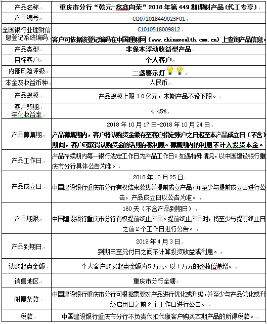 中国建设银行重庆市分行“乾元-鑫鑫向荣” 2018年第449期理财产品风险揭示书和产品说明书