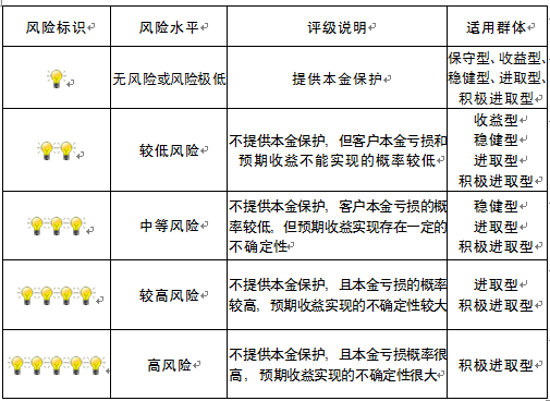 本产品为非保本浮动收益型理财产品,不保证本金和收益,请您充分认识投资风险,谨慎投资。本期产品期限为123天(中国建设银行有权对产品进行展期或提前终止),存续期内,产品不接受申购或赎回申请。本期产品内部风险评级级别为三盏警示灯 ,风险水平属于中等风险。最不利情况下,您将损失全部收益甚至包括全部本金。本理财产品适用于稳健型、进取型 、积极进取型客户。