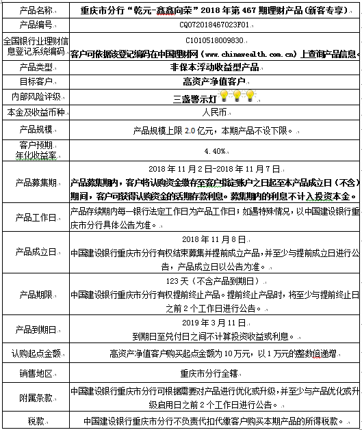 中国建设银行重庆市分行“乾元-鑫鑫向荣” 2018年第467期理财产品风险揭示书和产品说明书
