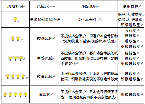 本产品为非保本浮动收益型理财产品,不保证本金和收益,请您充分认识投资风险,谨慎投资。本期产品期限为125天(中国建设银行有权对产品进行展期或提前终止),存续期内,产品不接受申购或赎回申请。本期产品内部风险评级级别为盏警示灯 ,风险水平属于中等风险。最不利情况下,您将损失全部收益甚至包括全部本金。本理财产品适用于稳健型、进取型 积极进取型客户。