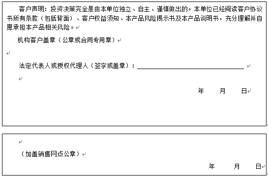 客户签名:                                    客户声明:投资决策完全是由客户独立、自主、谨慎做出的。客户已经阅读客户协议书所有条款(包括背面)、客户权益须知、本产品风险揭示书及本产品说明书,充分理解并自愿承担本产品相关风险。)