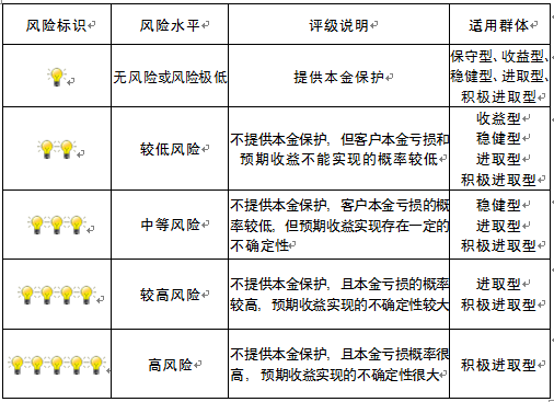 本产品为非保本浮动收益型理财产品,不保证本金和收益,请您充分认识投资风险,谨慎投资。本期产品期限104天(中国建设银行有权对产品进行展期或提前终止),存续期内,产品不接受申购或赎回申请。本期产品内部风险评级级别为盏警示灯,风险水平属于中等风险。最不利情况下,您将损失全部收益甚至包括全部本金。本理财产品适用于稳健型进取型 积极进取型客户。