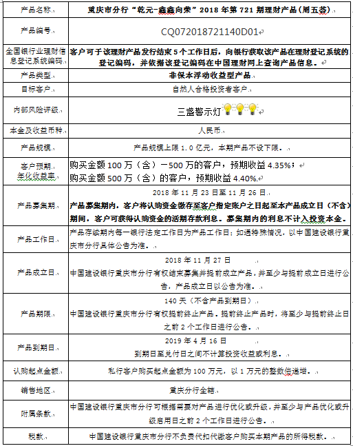 中国建设银行重庆市分行“乾元-鑫鑫向荣” 2018年第721期理财产品风险揭示书和产品说明书