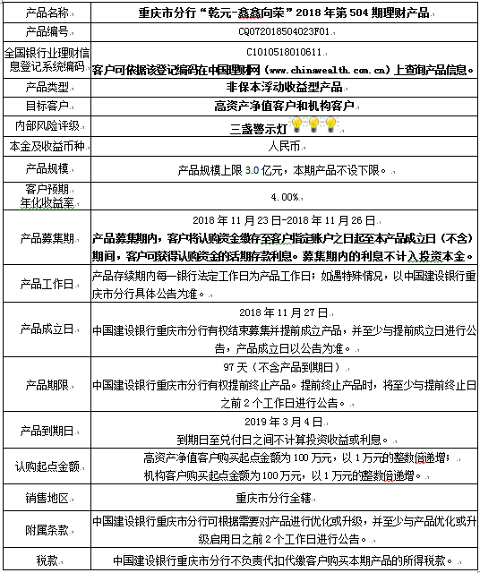 中国建设银行重庆市分行“乾元-鑫鑫向荣” 2018年第504期理财产品风险揭示书和产品说明书