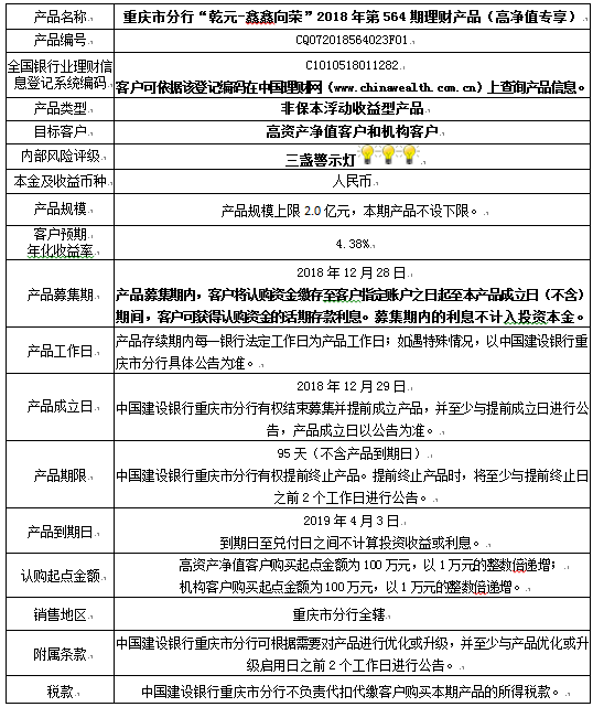 中国建设银行重庆市分行“乾元-鑫鑫向荣” 2018年第564期理财产品风险揭示书和产品说明书