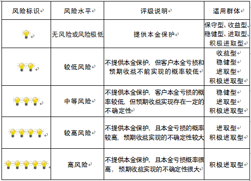 本产品为非保本浮动收益型理财产品,不保证本金和收益,请您充分认识投资风险,谨慎投资。本期产品期限为152天(中国建设银行有权对产品进行展期或提前终止),存续期内,产品不接受申购或赎回申请。本期产品内部风险评级级别为二盏警示灯 ,风险水平属于较低风险。最不利情况下,您将损失全部收益甚至包括全部本金。本理财产品适用于收益型、稳健型、进取型 、积极进取型客户。