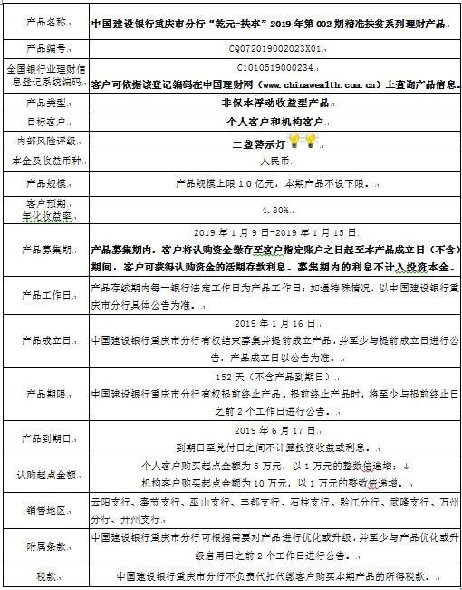 3.中国建设银行重庆市分行可根据市场情况等调整产品规模上、下限,并最迟于调整规模上下限当日进行公告。