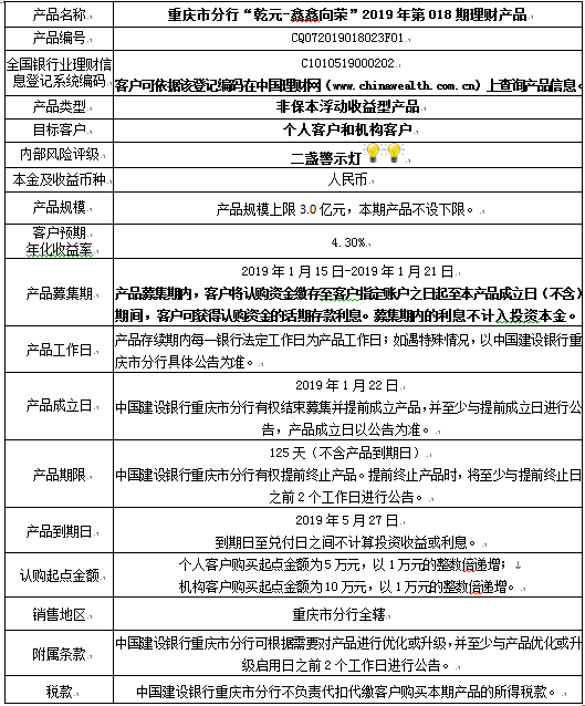 中国建设银行重庆市分行“乾元-鑫鑫向荣” 2019年第018期理财产品风险揭示书和产品说明书