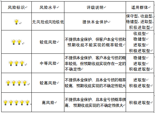 本产品为非保本浮动收益型理财产品,不保证本金和收益,请您充分认识投资风险,谨慎投资。本期产品期限为178天(中国建设银行有权对产品进行展期或提前终止),存续期内,产品不接受申购或赎回申请。本期产品内部风险评级级别为盏警示灯 ,风险水平属于中等风险。最不利情况下,您将损失全部收益甚至包括全部本金。本理财产品适用于稳健型、进取型 积极进取型客户。