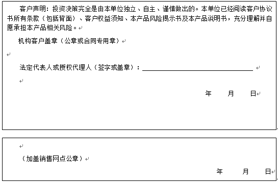 客户签名:                                    客户声明:投资决策完全是由客户独立、自主、谨慎做出的。客户已经阅读客户协议书所有条款(包括背面)、客户权益须知、本产品风险揭示书及本产品说明书,充分理解并自愿承担本产品相关风险。)
