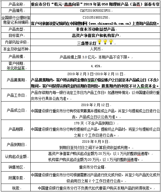 3.中国建设银行重庆市分行可根据市场情况等调整产品规模上、下限,并最迟于调整规模上下限当日进行公告。