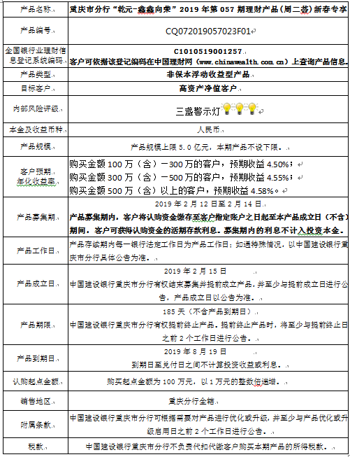 中国建设银行重庆市分行“乾元-鑫鑫向荣” 2019年第057期理财产品风险揭示书和产品说明书