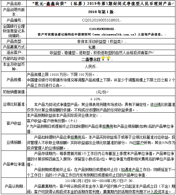中国建设银行重庆市分行“乾元-鑫鑫向荣”(私募)2019年 第5期封闭式净值型人民币理财产品风险揭示书和产品说明书