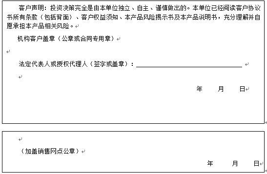 客户签名: ( 客户声明:投资决策完全是由客户独立、自主、谨慎做出的。客户已经阅读客户协议书所有条款(包括背面)、客户权益须知、本产品风险揭示书及本产品说明书,充分理解并自愿承担本产品相关风险。)