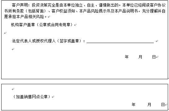 客户签名:                                    客户声明:投资决策完全是由客户独立、自主、谨慎做出的。客户已经阅读客户协议书所有条款(包括背面)、客户权益须知、本产品风险揭示书及本产品说明书,充分理解并自愿承担本产品相关风险。)