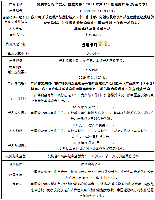 中国建设银行重庆市分行“乾元-鑫鑫向荣” 2019年第621期理财产品风险揭示书和产品说明书