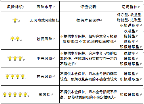 本产品为非保本浮动收益型理财产品,不保证本金和收益,请您充分认识投资风险,谨慎投资。本期产品期限为246天(中国建设银行有权对产品进行展期或提前终止),存续期内,产品不接受申购或赎回申请。本期产品内部风险评级级别为三盏警示灯 ,风险水平属于中等风险。最不利情况下,您将损失全部收益甚至包括全部本金。本理财产品适用于稳健型、进取型 、积极进取型客户。