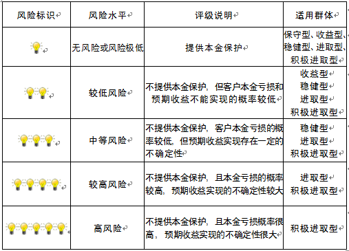 本产品为非保本浮动收益型理财产品,不保证本金和收益,请您充分认识投资风险,谨慎投资。本期产品期限为123天(中国建设银行有权对产品进行展期或提前终止),存续期内,产品不接受申购或赎回申请。本期产品内部风险评级级别为三盏警示灯,风险水平属于中等风险。最不利情况下,您将损失全部收益甚至包括全部本金。本理财产品适用于稳健型、进取型 、积极进取型客户。