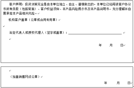 客户签名:                                    客户声明:投资决策完全是由客户独立、自主、谨慎做出的。客户已经阅读客户协议书所有条款(包括背面)、客户权益须知、本产品风险揭示书及本产品说明书,充分理解并自愿承担本产品相关风险。)
