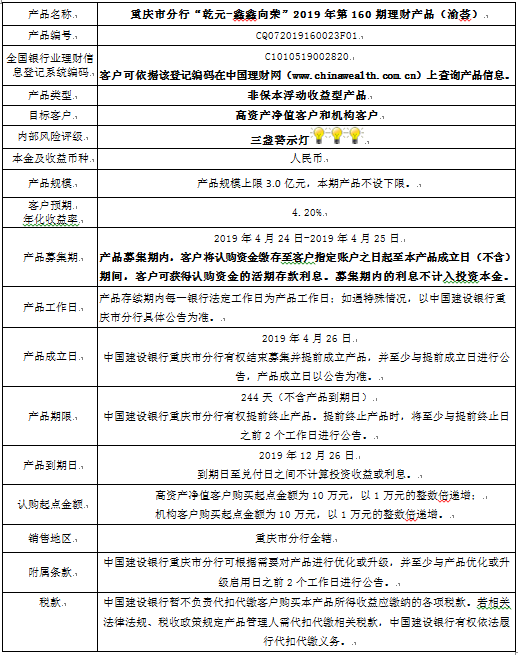 3.中国建设银行重庆市分行可根据市场情况等调整产品规模上、下限,并最迟于调整规模上下限当日进行公告。