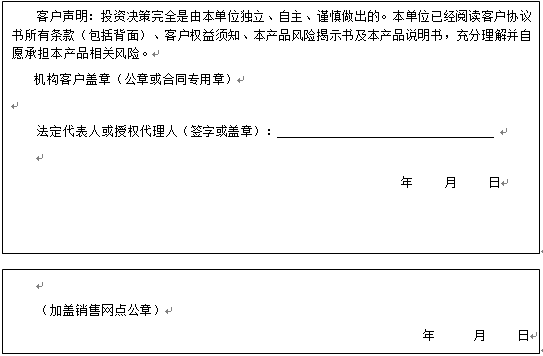 客户签名:                                    客户声明:投资决策完全是由客户独立、自主、谨慎做出的。客户已经阅读客户协议书所有条款(包括背面)、客户权益须知、本产品风险揭示书及本产品说明书,充分理解并自愿承担本产品相关风险。)