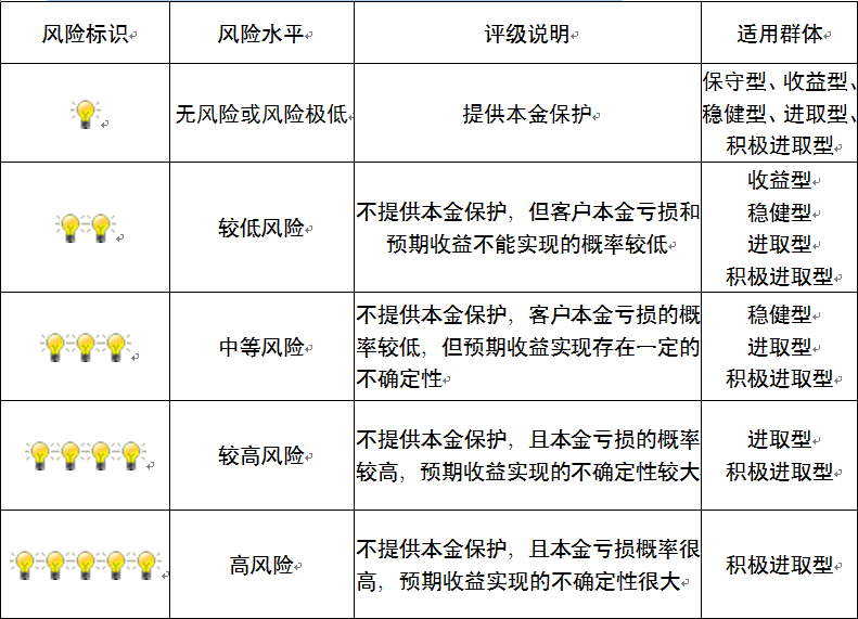 本产品为非保本浮动收益型理财产品,不保证本金和收益,请您充分认识投资风险,谨慎投资。本期产品期限为224天(中国建设银行有权对产品进行展期或提前终止),存续期内,产品不接受申购或赎回申请。本期产品内部风险评级级别为盏警示灯 ,风险水平属于中等风险。最不利情况下,您将损失全部收益甚至包括全部本金。本理财产品适用于稳健型、进取型 积极进取型客户。